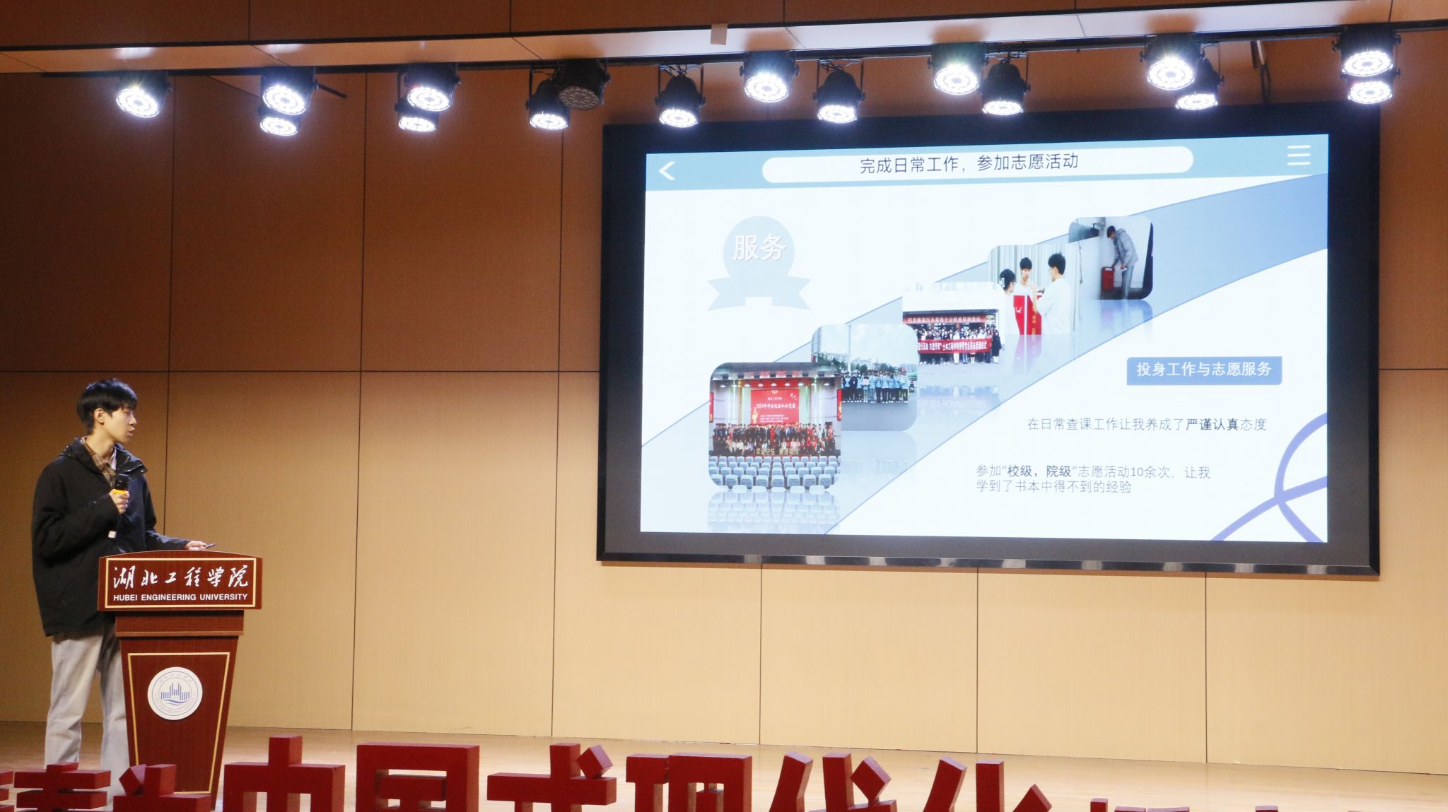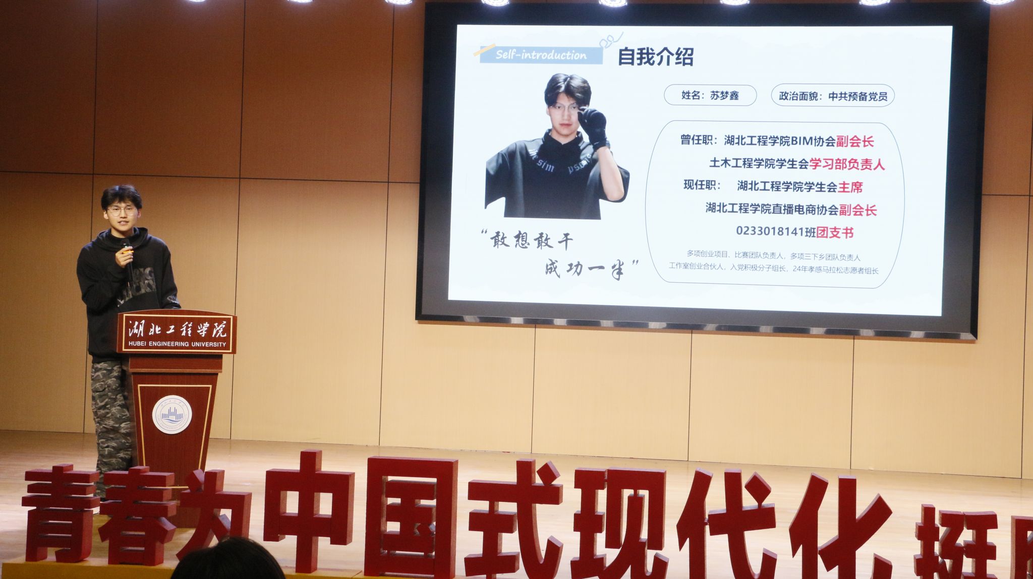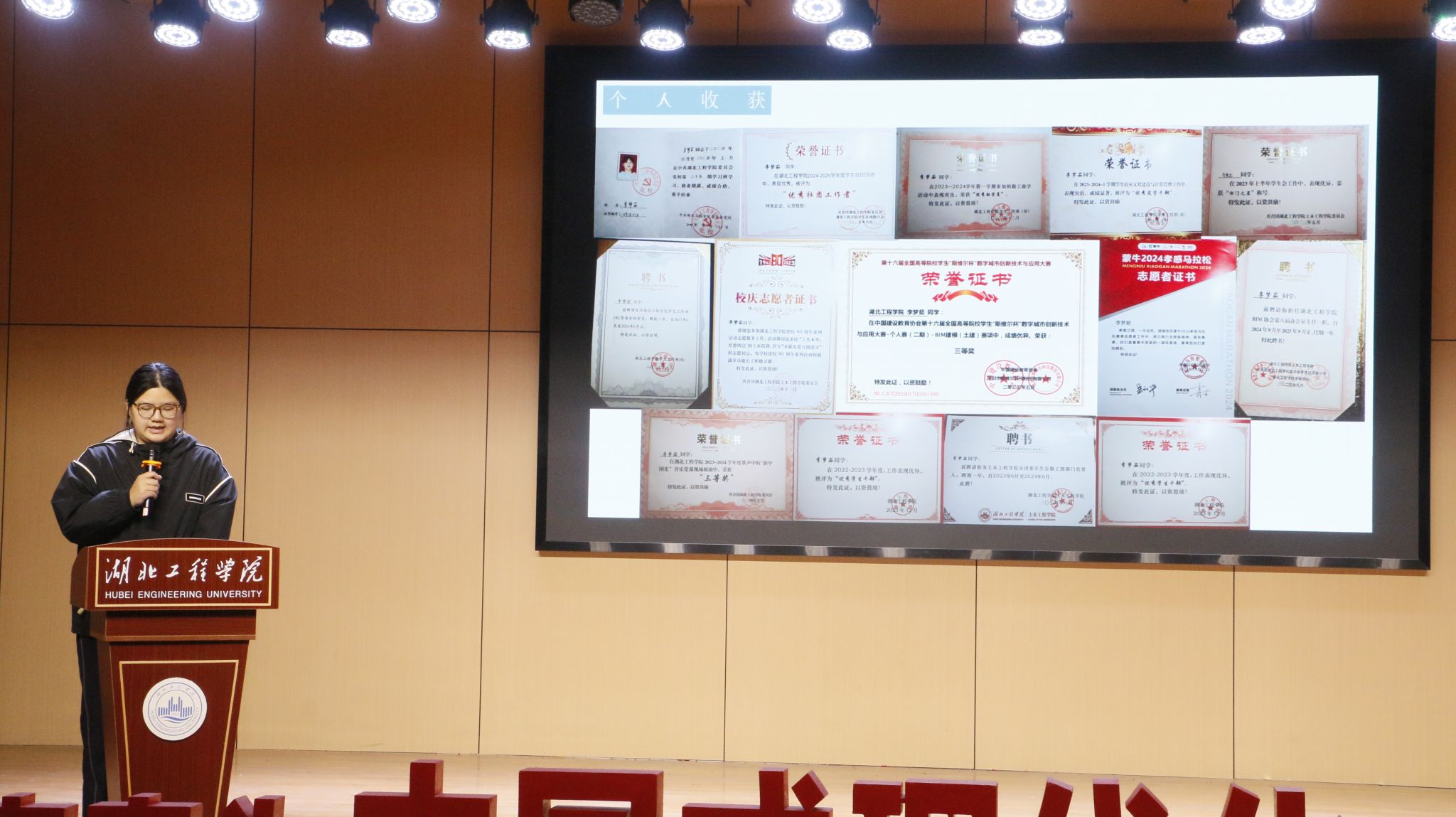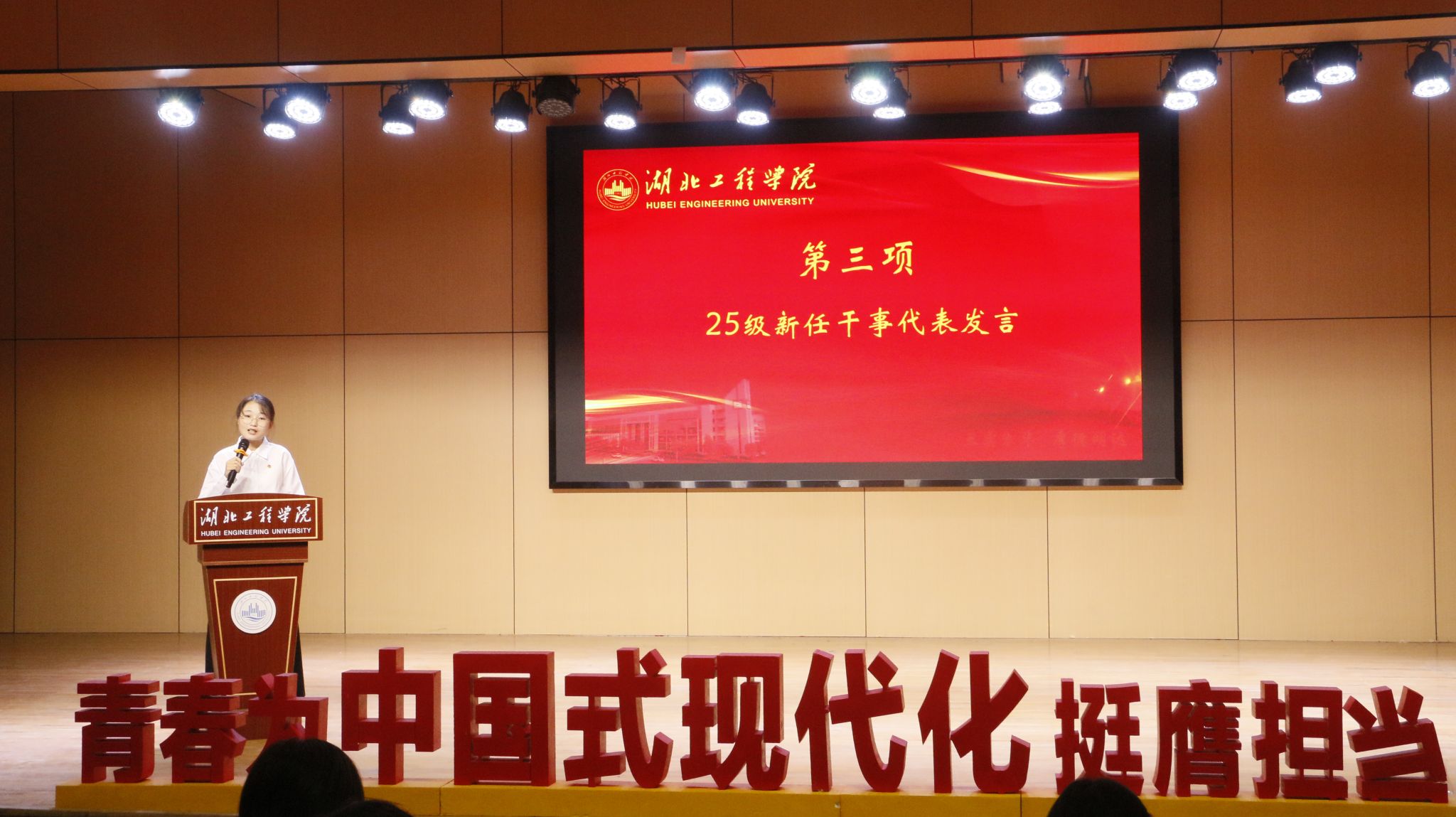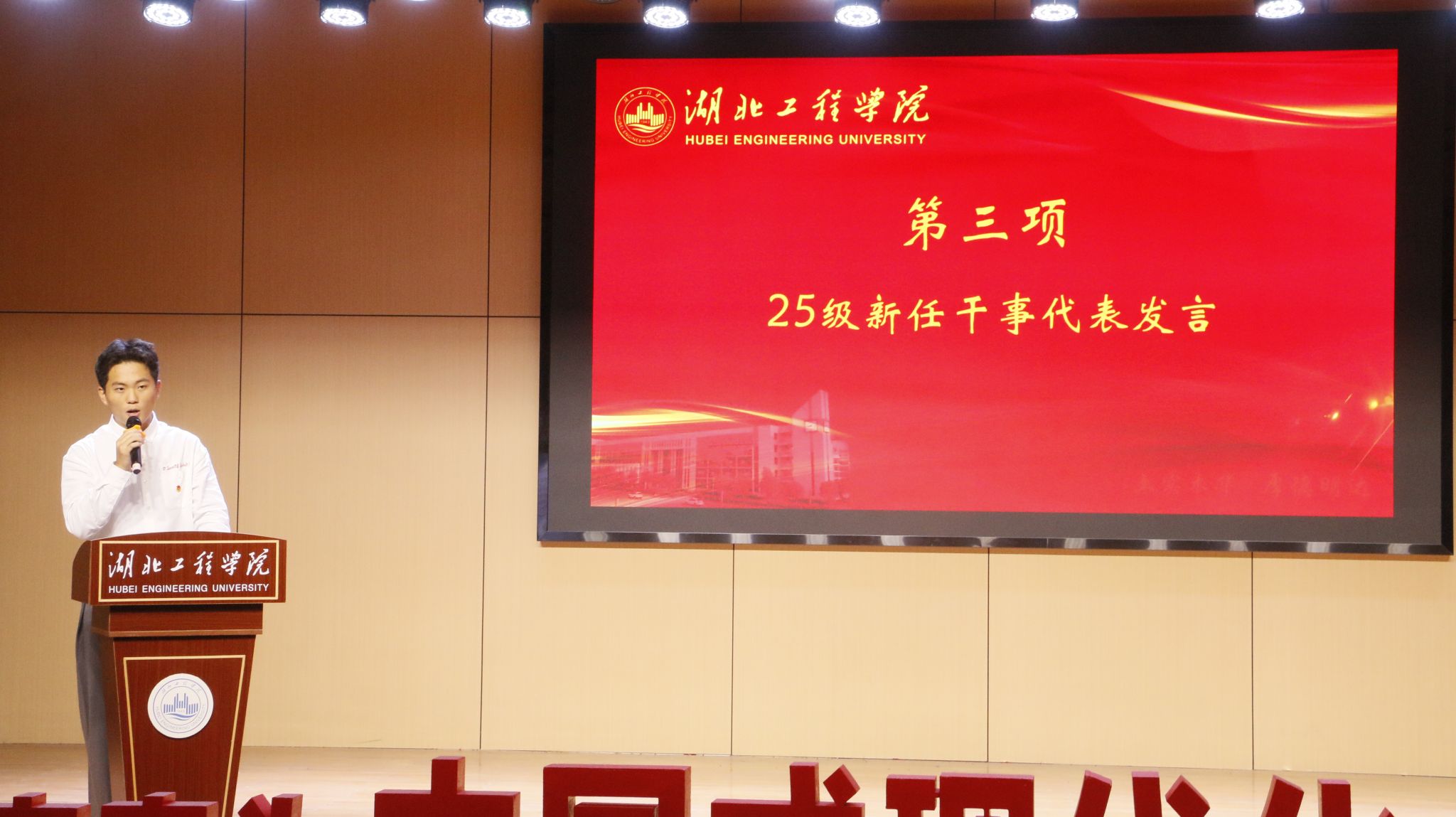 会议第二项议程,历任学生干部代表和莹、李梦茹、赵俊豪、苏梦鑫四位同学依次上台分享。他们结合自身经历,从志愿服务、创新实践、学习工作和团队协作等多个角度,分享了宝贵的经验和心得。他们真挚的讲述中充满了对团学工作的热爱与不舍,并寄语新成员们要“敢于担当,乐于奉献,善于学习”,将土木工程学院团学组织的优良传统发扬光大。