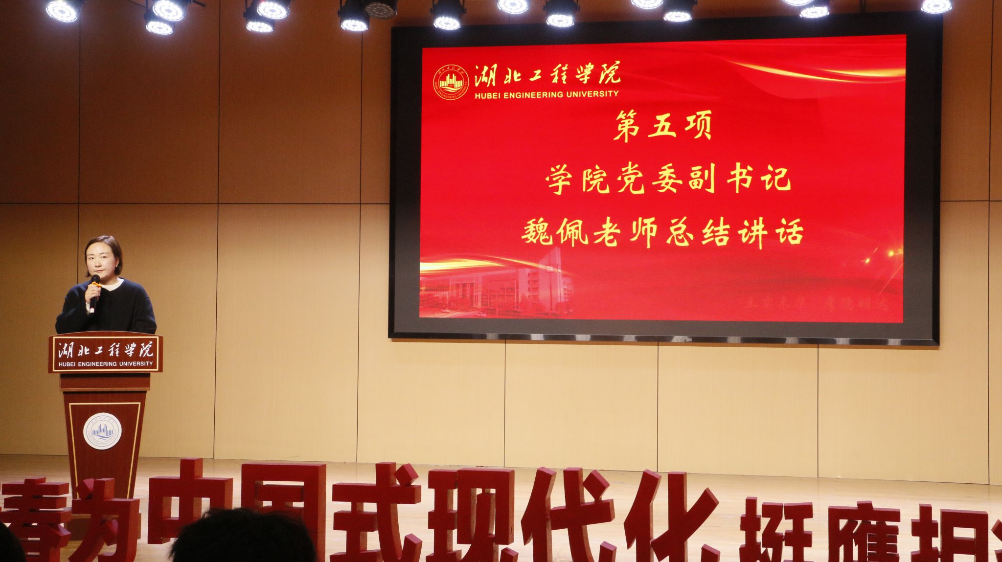 会议最后,学院党委副书记魏佩老师作总结讲话。魏书记首先对荣获表彰的优秀团学干部表示祝贺,对历任干部的辛勤付出表示感谢,并对新成员的加入表示热烈欢迎。她指出,学生干部是学院与学生之间至关重要的桥梁与纽带,是推动学院事业发展的重要力量。魏书记对新一届学生干部提出三点希望:一是要坚定理想信念,牢记加入学生组织的初心,在服务同学中锻炼自己;二是要做好桥梁作用,从师生实际需求出发思考问题、解决问题;三是要学会抬头看路,在实干中锤炼本领。她强调,“砼”字象征着土木人的坚实与凝聚,学院团委和学工办老师将是全体学生干部最坚实的力量,希望大家能携手并进,共同“砼”筑梦想,奔赴学院更加辉煌的未来。