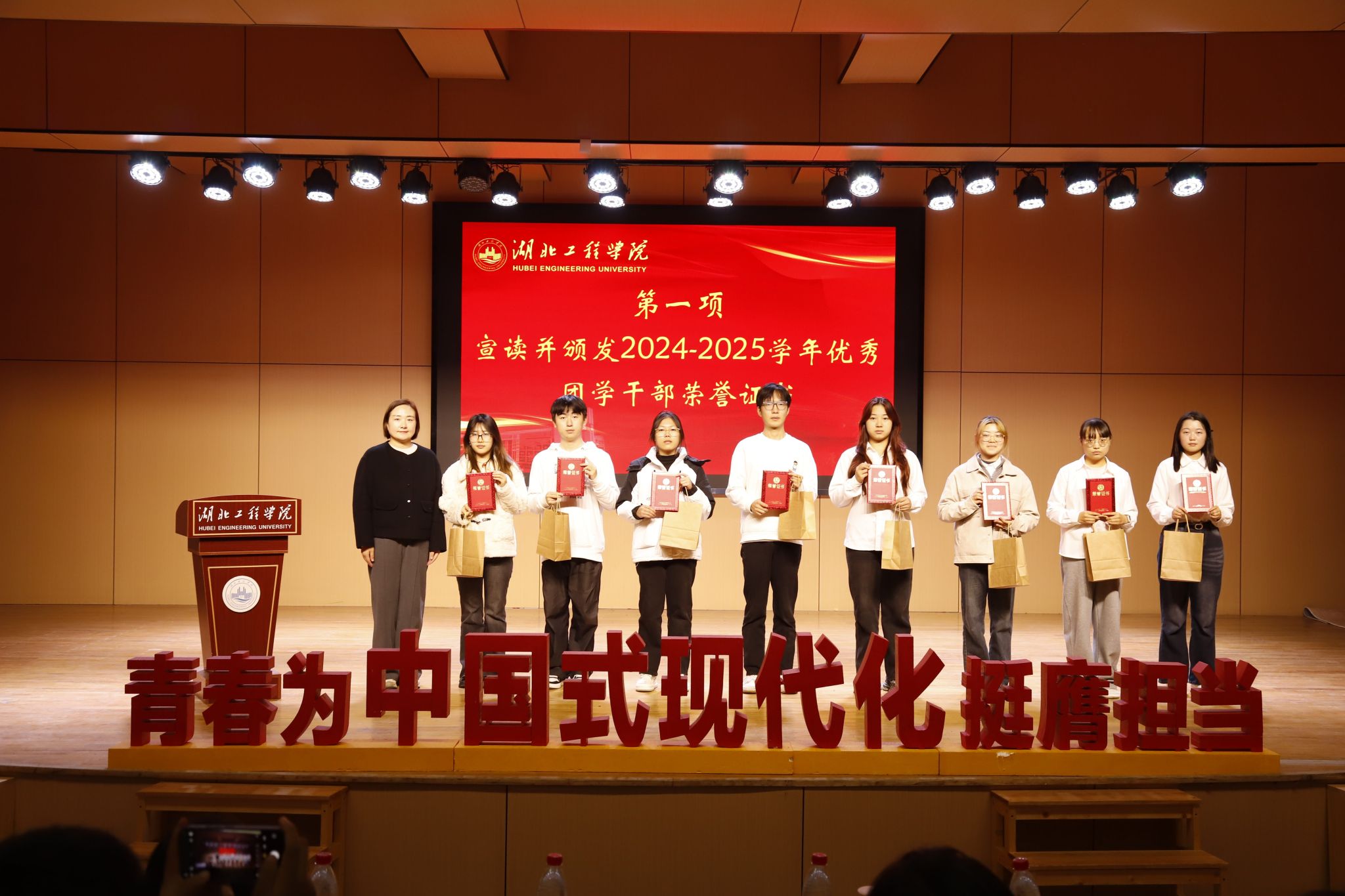 会议第一项议程,辅导员尹驰老师宣读了《关于表彰土木工程学院2024-2025学年优秀团学干部的决定》,对周伊纯等8名为学院团学工作表现突出的同学予以表彰。在热烈的掌声中,党委副书记魏佩老师为获奖代表颁发了荣誉证书。这份荣誉,不仅是对他们过去一年辛勤付出的肯定,更是对全体学生干部的激励与鼓舞。