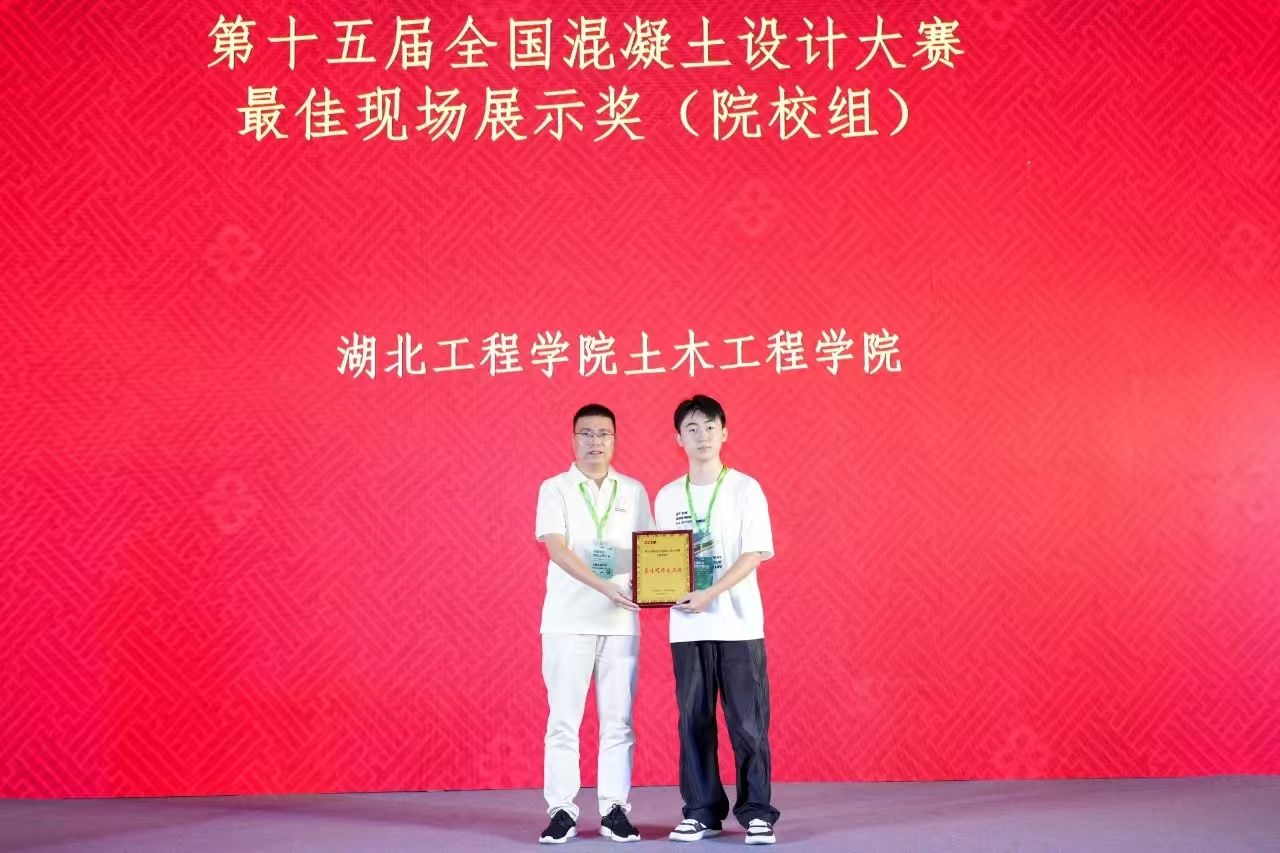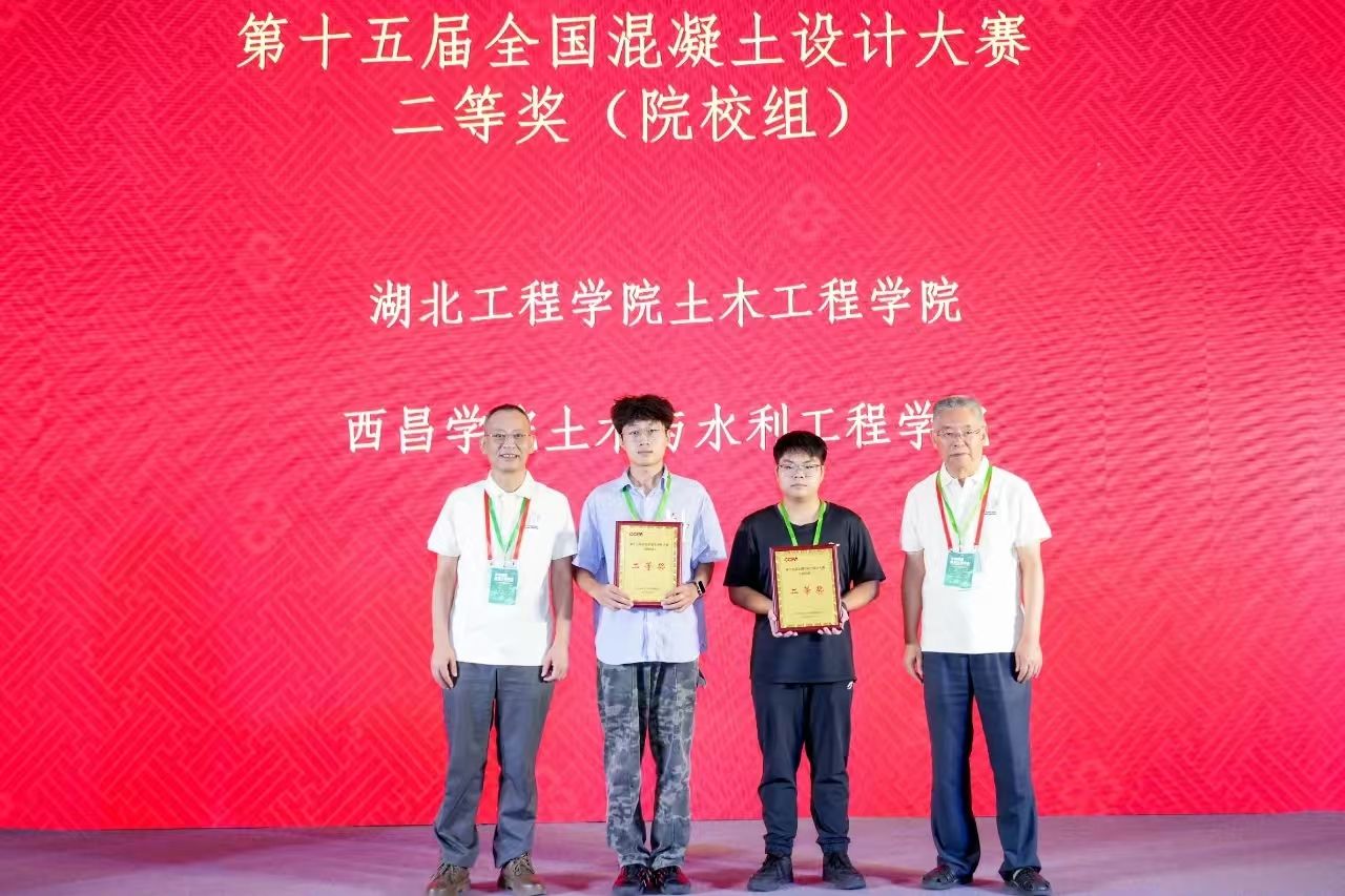 2025年9月6日,在第十五届全国混凝土设计大赛上,湖北工程学院土木工程学院师生团队(学生:阮金灿,赵俊豪,梁好,薛丽丽,陈玉洁;指导教师:夏志林,陈潘)凭借出色的表现,综合排名第2,再一次荣获院校组二等奖,同时梁好同学现场表现优异,斩获"最佳现场展示奖",为学院再添荣誉!