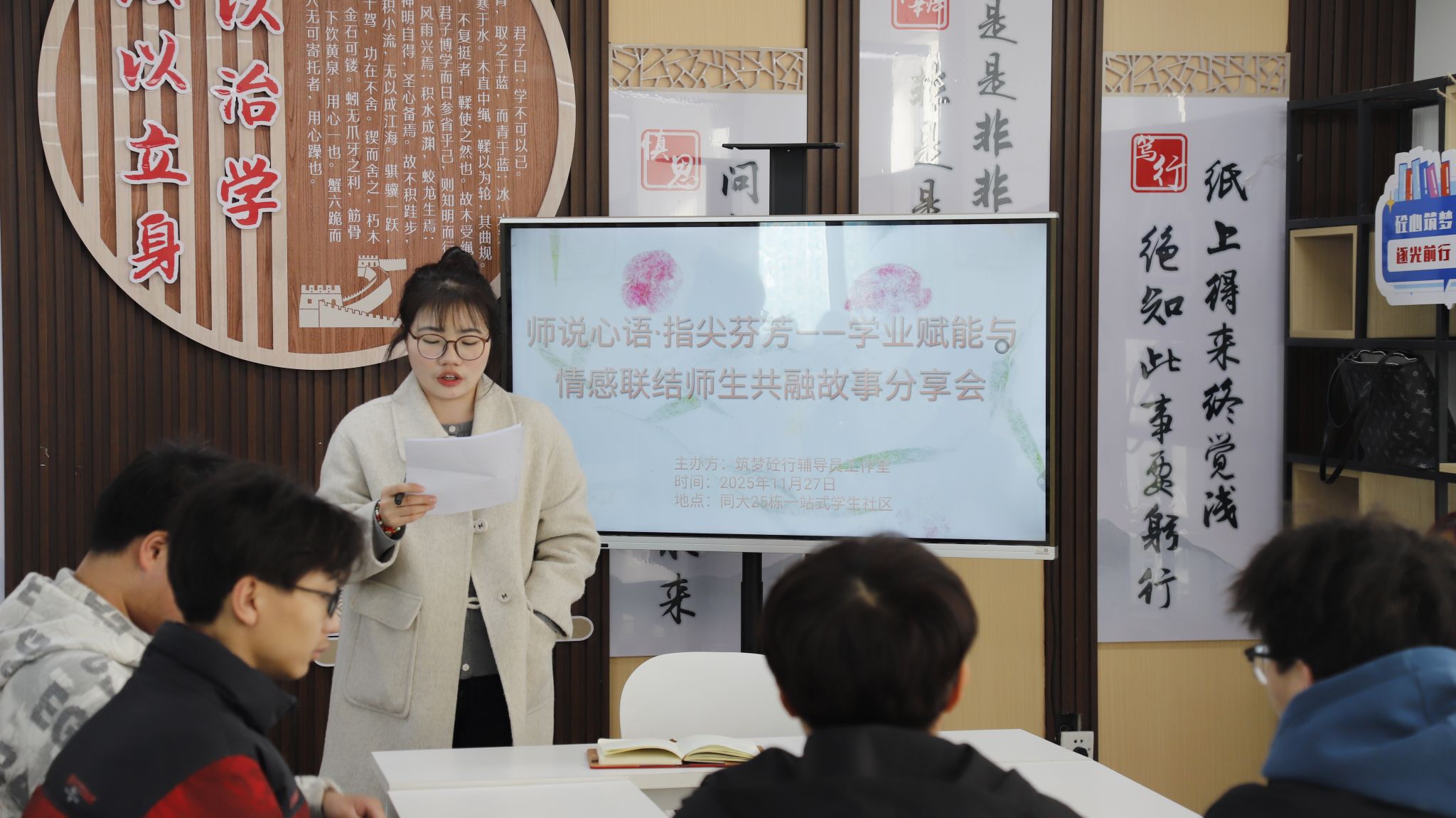 为深化“三全育人”工作实效,筑牢“一站式”学生社区心理支持防线,2025年11月27日,土木工程学院筑梦砼行辅导员工作室在同大25栋“一站式”学生社区多功能活动室匠心打造了“师说心语·指尖芬芳”师生共融与心理赋能故事分享会。本次活动旨在破解工科学业压力下师生交流、生生交流不足的难题,将学业发展、情感联结与心理健康教育有机融合,为师生构建了一个释放压力、倾诉心声的温暖港湾。