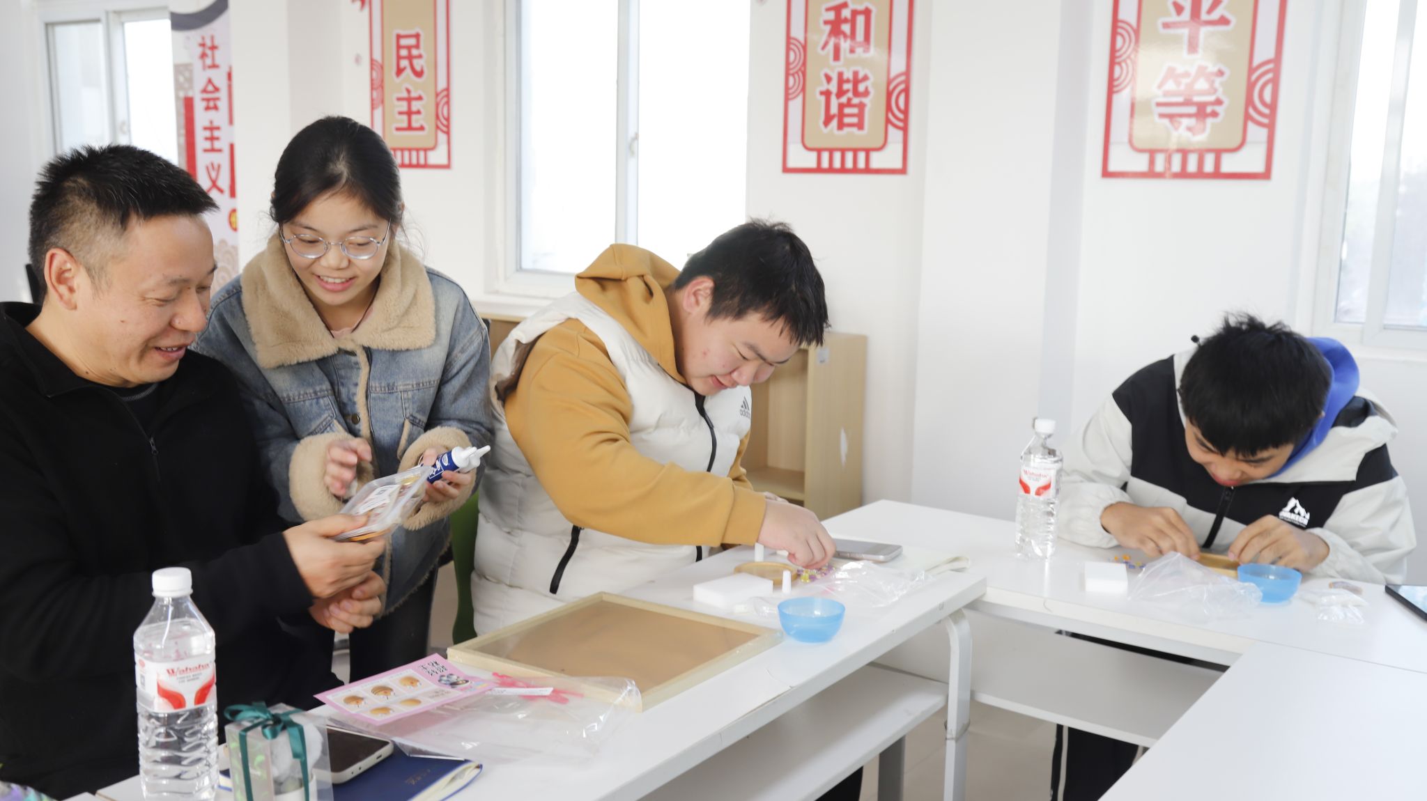 作为心理赋能的创新环节,接下来的“共创·手作时光”深受欢迎。师生们混合编组,共同投入创意杯垫、车挂香囊和手做相框的制作中。这种需要专注与耐心的手工艺活动,本身就是一种有效的正念练习和压力管理方式,能够让同学们从紧张的公式演算中暂时抽离,获得心灵的放松与疗愈。在指尖的协作中,师生间的交流变得更为轻松自然,围绕学业、生活乃至个人困惑的深入交谈在小组内悄然发生,建立了牢固的社会支持网络,有效缓解了学生的孤独感。