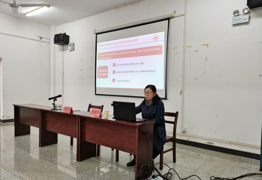 宣讲会分三个主题。文学与新闻传播学院党总支书记来秀明以《发挥制度优势 凸显治理效能》为主题,从完善和发展我国国家制度和治理体系重大意义,坚定中国特色社会主义制度自信,完善和发展我国国家制度和治理体系的基本路径三个方面,要求我们在今后的学习工作中大力弘扬生命至上、举国同心、舍生忘死、尊重科学、命运与共的伟大抗疫精神,为学校的高质量发展做出自己应有的贡献。