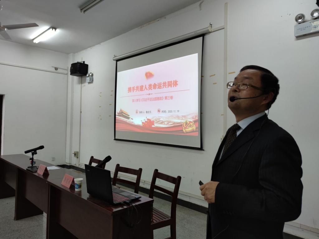 外国语学院党总支书记鲁定元以《携手共建人类命运共同体》为主题,介绍了从伟大构想应时顺势、鲜明旗帜广泛认同、中国行动彰显担当、命运与共前景可期四个方面,对中国构建人类命运共同体的伟大意义进行了深刻阐释。